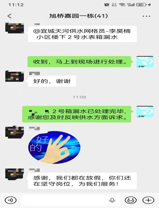 “感謝,我們都在放假,你們還堅守崗位,為我們服務(wù)!”10月5日11時08分,宜城市旭橋嘉園小區(qū)業(yè)主李女士在小區(qū)業(yè)主群里,向襄陽水務(wù)集團(tuán)宜城天河供水有限公司網(wǎng)格員李昊楠發(fā)來感謝消息。而就在23分鐘前,她剛反映家中停水問題,現(xiàn)在水管故障已徹底解決,如此高效的服務(wù)響應(yīng)讓業(yè)主倍感貼心。